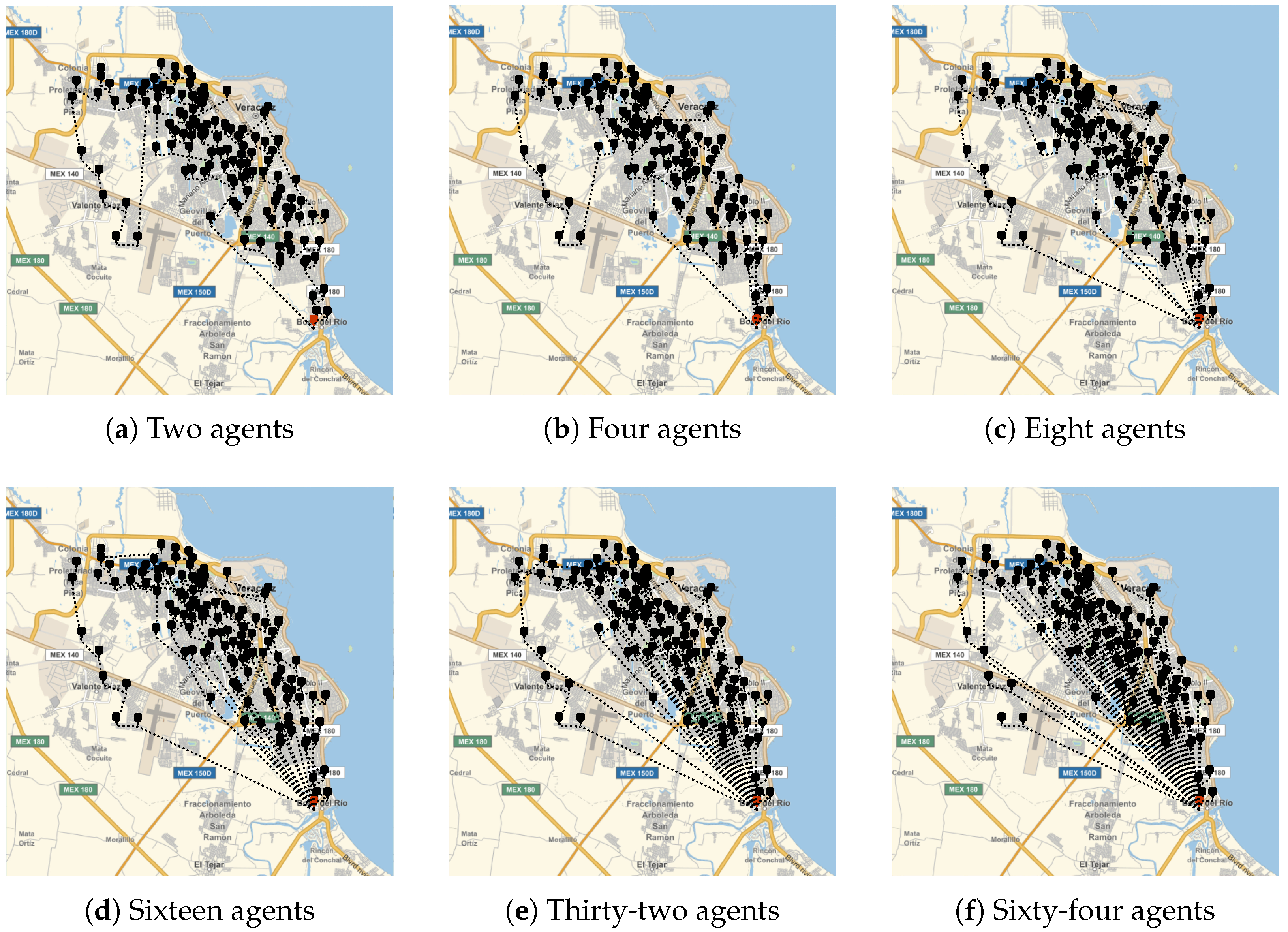 First, it is necessary to determine the number of agents required to deliver the merchandise. Since all agents depart from a single location (the distribution center), the total number of delivery points is reduced by one to determine the number of possible divisions. Each division represents an alternative configuration for distributing routes in a balanced manner. In the case of the ten georeferenced locations from Figure 2a, this results in one valid division with three agents. Therefore, a balanced distribution of delivery locations is achieved, assigning an equal number of locations to each agent.