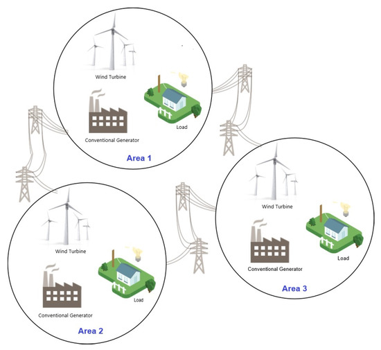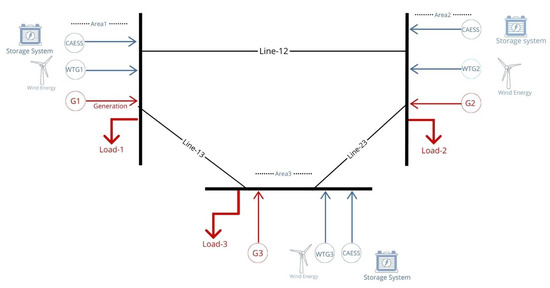 Three regions of the electric power system were examined comprehensively, all interconnected by tie lines, as illustrated in Figure 4. Each area had its conventional power capacity, specific wind profile, and load, as listed in Table 3. Tie lines connected each area with capacities shown in Table 4.