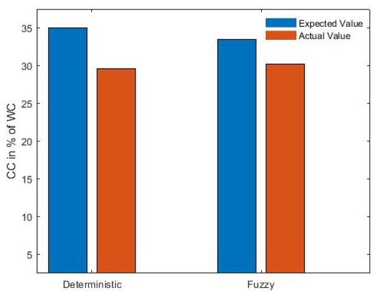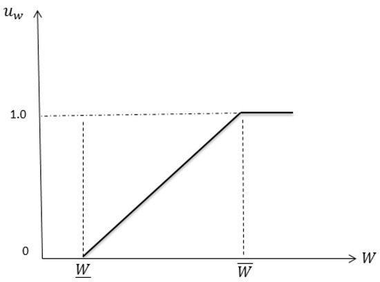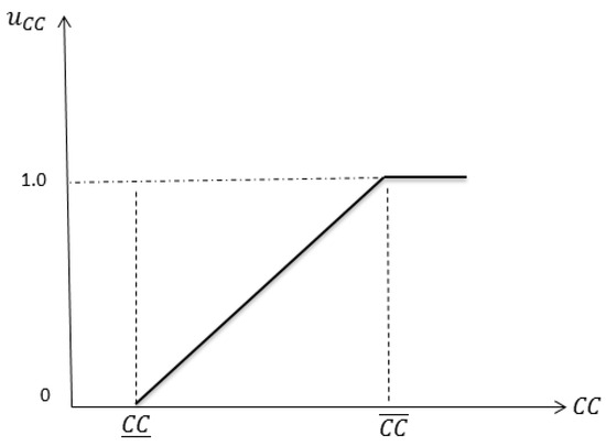The value of the CC was determined using a deterministic model. The power system planner set the upper limit and the lower limit . In the fuzzy model, the deterministic objective function was treated as a constraint. This means that the membership function of the CC became a fuzzy constraint in Equation (24). The membership function of the CC is illustrated in Figure 2.