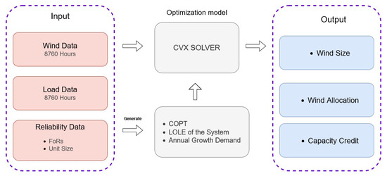The deterministic optimization problem of maximizing CC under the constraints (1)–(16) was solved through mixed-integer linear programming (MILP) using the CVX toolbox in the MATLAB software environment (R2019b) with the Gurobi solver. CVX is a high-level modeling framework for convex optimization, and Gurobi is a state-of-the-art commercial solver for linear and mixed-integer programs. The algorithm was composed of three processes: (1) formulating the linear objective function and constraints (1)–(16) with binary variables () to enforce exclusive CAESS modes, (2) inputting the system data and reliability metric, and (3) solving the MILP using CVX to find optimal wind allocations and total wind capacity.
