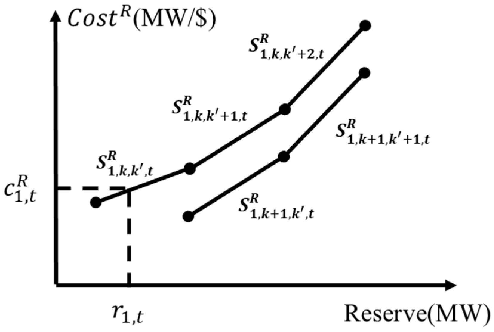 The objective is to minimize the system operating cost, considering the bids for distribution networks. The first term includes energy cost, reserve cost, no-load loss cost, and startup cost of the thermal units, and the second term includes the energy and reserve costs on the distribution side. The term C g · represents the bid of unit g at time period t , while C g R · denotes the bid associated with providing reserve. Specifically, C d · represents the bid provided by distribution network d at time period t , while C d R · denotes the bid associated with providing reserve of distribution network d at time period t . Both C g · and C g R · are monotonically increasing bidding curves, as shown in Figure 1. Similarly, C d · and C d R · follow the same form. The construction of then will be discussed in the next section.