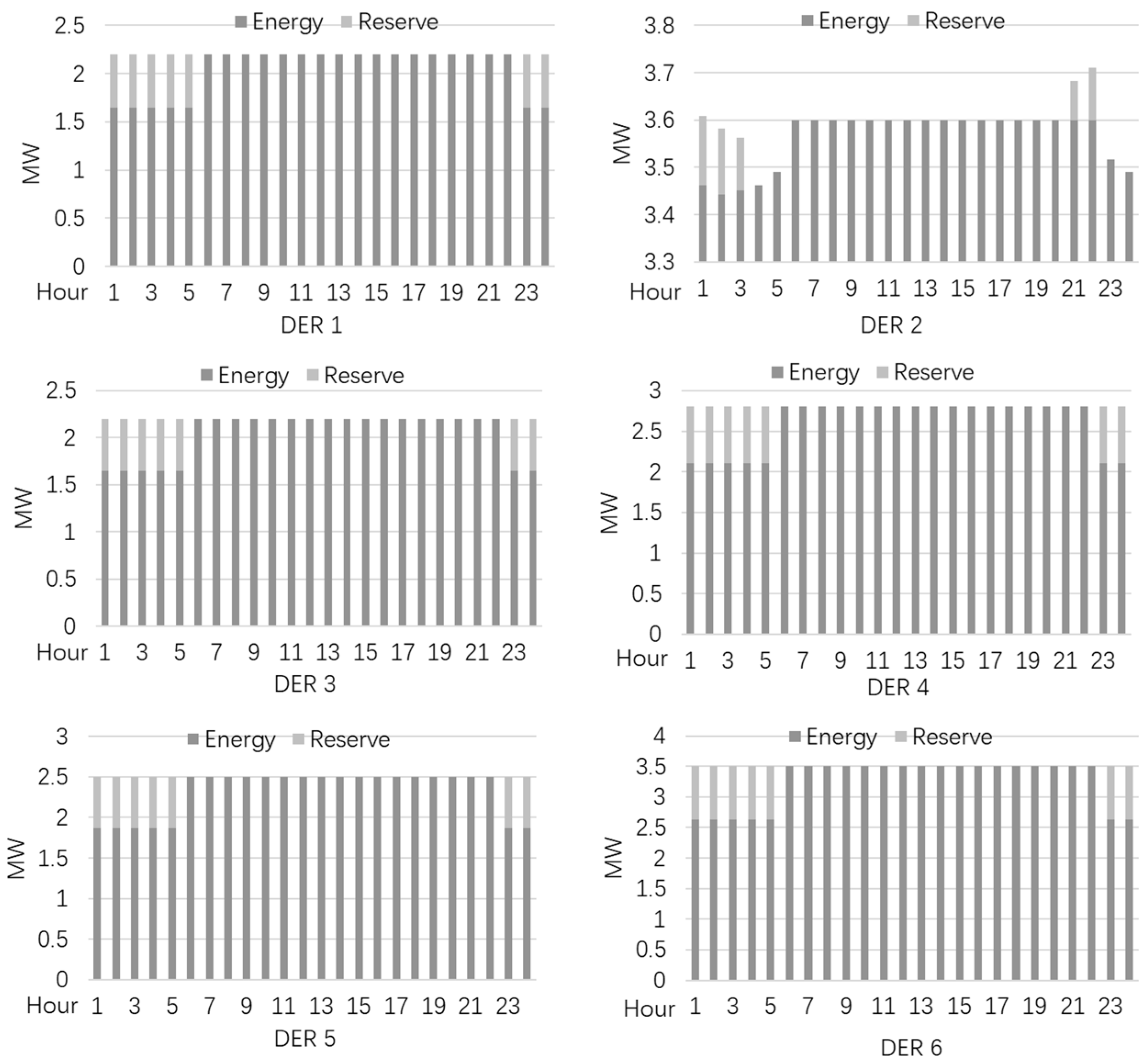 Figure 14. Awarded energy and reserve of distribution system 1 with low reserve price.