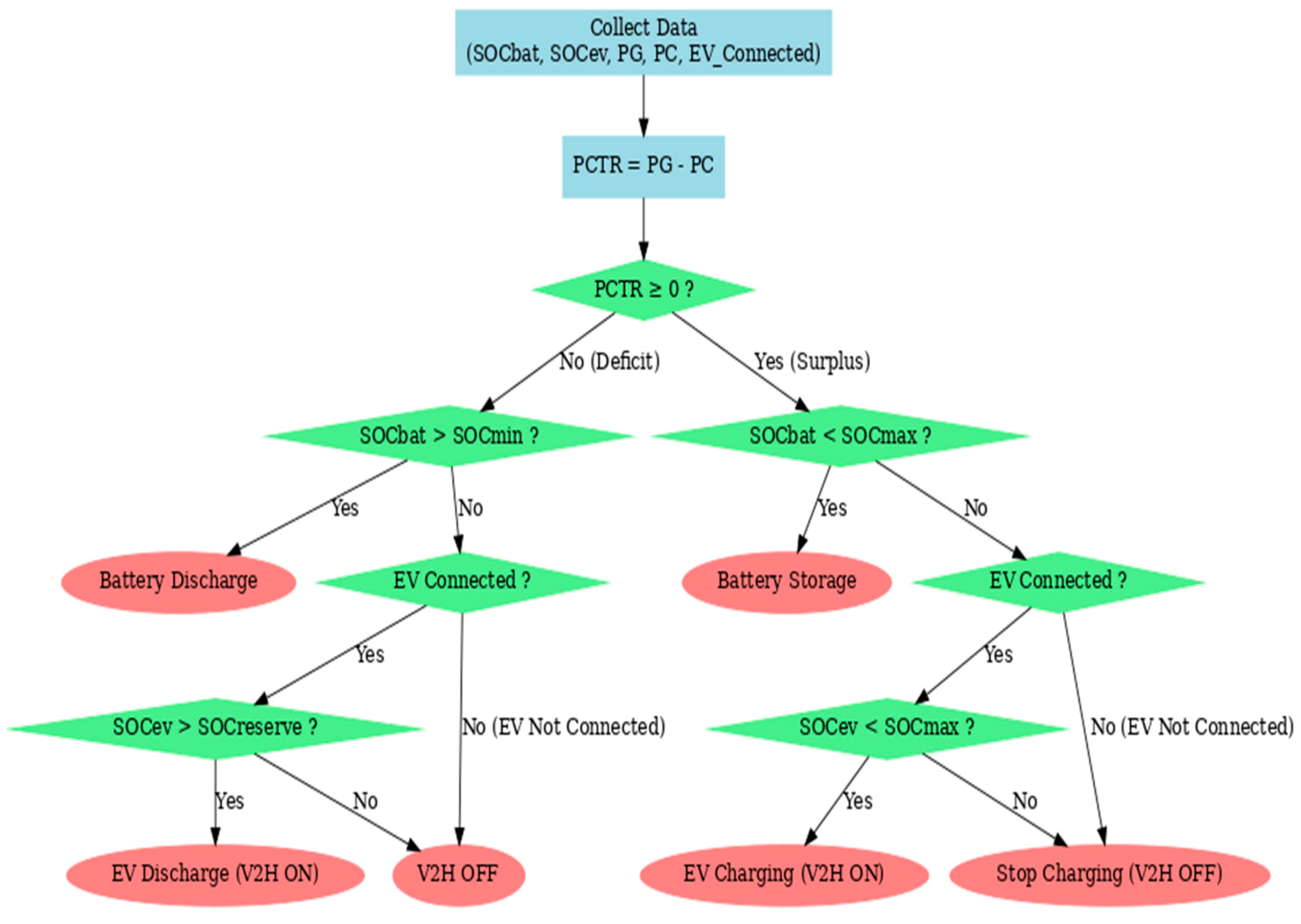 Figure 6 provides a focused view on the control of the V2H interface by determining whether the EV should operate in charging or discharging mode. This decision is governed not only by the surplus/deficit status and SOC thresholds but also by user-defined preferences and the mobility reserve constraint.