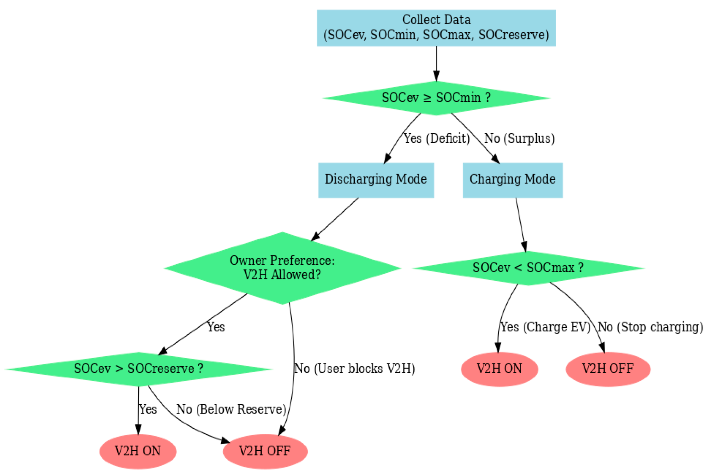 This refined flowchart introduces an intelligent control layer that integrates both technical and user centric constraints, enabling safe and efficient bidirectional power exchange. By preserving transportation reliability while flexibly supporting household energy needs, it ensures that V2H operation contributes to cost-effectiveness and sustainability without compromising the primary function of the vehicle.
