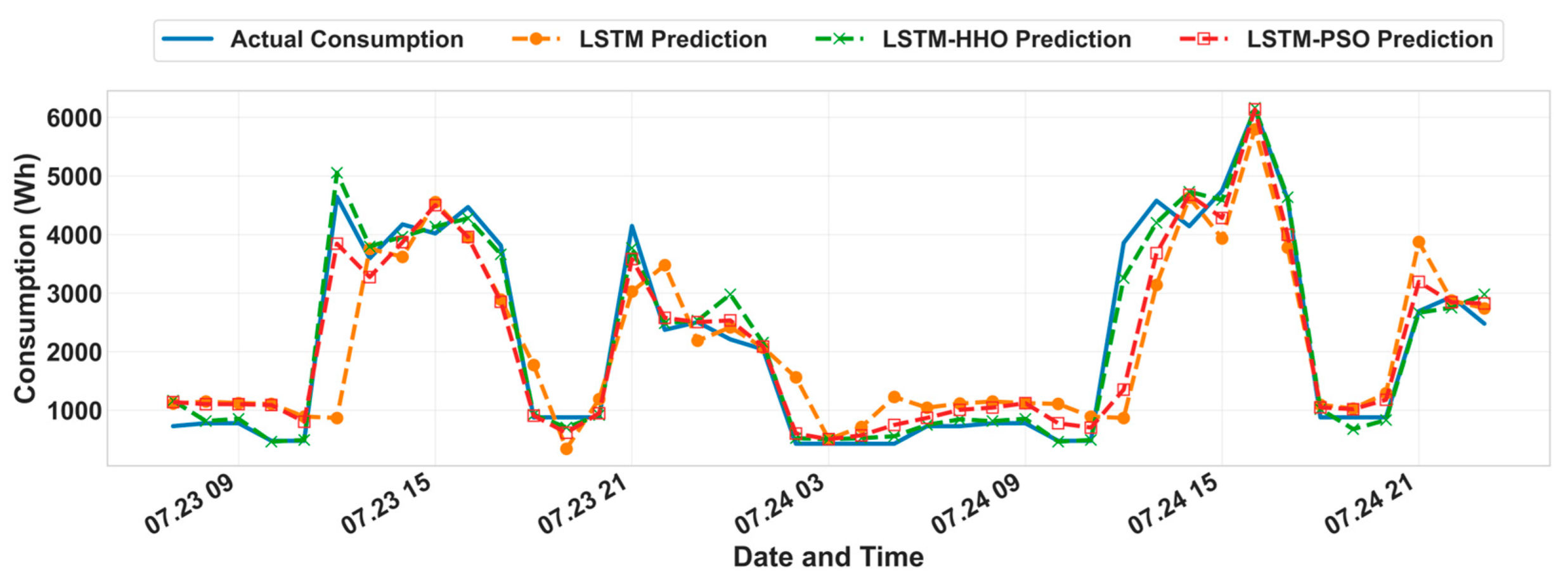 Figure 8 compares actual power consumption with the one-hour-ahead predictions of three models: baseline LSTM, LSTM-PSO, and the proposed LSTM-HHO. The LSTM-HHO model demonstrates the highest prediction accuracy, closely tracking real consumption during both steady and peak demand periods.