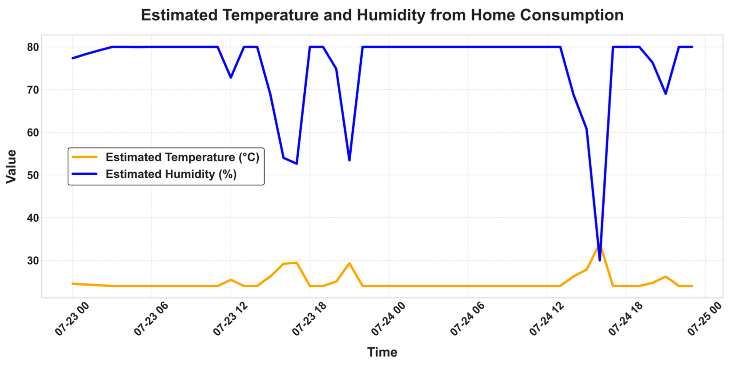 Figure 10, temperature remains relatively stable while humidity shows abrupt drops, highlighting the limitations of inference from consumption data. In contrast,