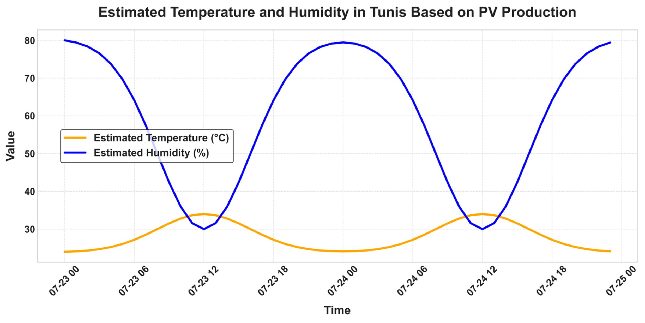 Figure 11 exhibits smoother diurnal patterns: temperature rises during the day and decreases at night, while humidity follows an opposite trend. These realistic dynamics align with local weather in Tunis, validating PV-based estimation as a reliable proxy for outdoor conditions. Integrating these contextual variables into the EMS is particularly valuable, since climate-sensitive loads such as air conditioning and heating represent a major share of residential consumption in Tunisia. By anticipating variations in temperature and humidity, the EMS can proactively adjust load scheduling and battery management, thereby improving energy balance, reducing costs, and enhancing user comfort.