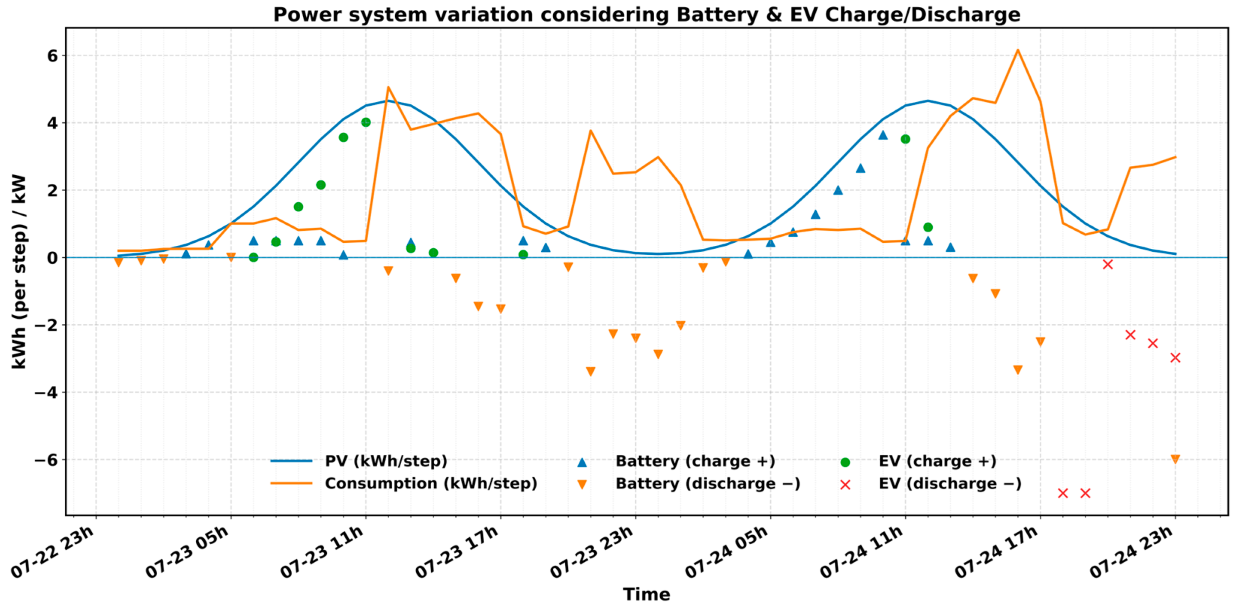 Figure 12 illustrates the dynamic behavior of the off-grid PV system with integrated home battery storage and EV. The blue curve represents the PV generation profile, while the orange curve corresponds to the household consumption over two days. Positive markers indicate charging phases, whereas negative markers indicate discharging phases. The triangular markers correspond to the home battery, which is charged first during surplus PV production and discharged to meet load deficits. Circular and cross markers correspond to the EV, which absorbs surplus energy when the battery is near full and contributes power back to the household load (V2H) during deficit periods, especially towards the end of the horizon when both storage systems approach their minimum state of charge. This coordinated strategy highlights the complementary operation of the battery and EV to ensure energy balance, avoid oversizing, and improve system reliability.