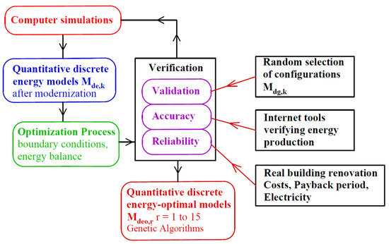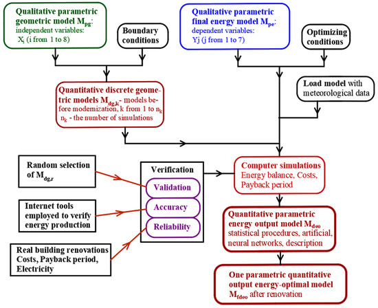 An automated process of modernization of multi-story student dormitories located in temperate climate was defined to optimize the energy delivered with external nets to meet the current needs related to internal and external equipment. This process was based on proprietary computer simulations using several innovative models. In particular, this automation involved novel iterative calculations performed with the help of the novel proprietary Rhino/Grasshopper application related to the following: (1) creating a qualitative parametric input model of the modernized building, defined by eight independent variables Xi (i = 1 to 8), (2) defining new multiple quantitative discrete input models of the modernized buildings by assigning specific values to Xi, (3) simulating the energy performance of the above discrete models equipped with PV panels, (4) obtaining novel discrete quantitative output models as a result of the original computer simulations, defining discrete states after modernization, and (5) creating a qualitative parametric output model defined using a number of the dependent variables Yj describing the energy and costs of modernization of student dormitories. Finally, the resulting optimal quantitative model of dormitories after modernization was shaped, meeting the assumed boundary and optimizing conditions.