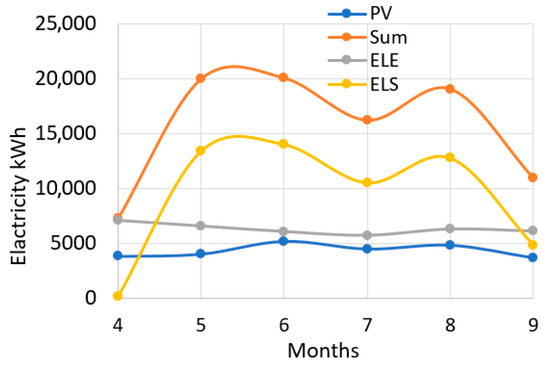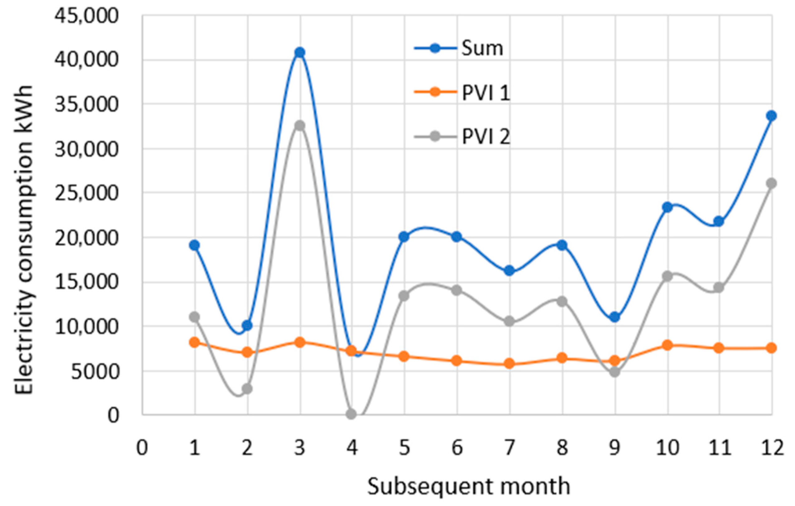 Figure 3 shows the electricity production from the panels mounted on the façade of the IKAR student residence hall. The electricity production began in April 2025, i.e., in the fourth month and is measured in the subsequent five months until September. The PV line represents the electricity produced with PVI arranged on IKARS’s south-eastern façade. This line presents an electricity production of 23.5∙10