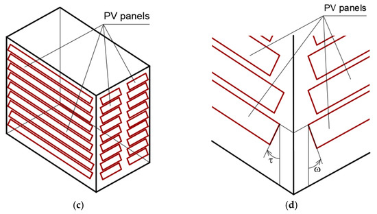 Figure 4d presents a detail of the inclination of PV panels on the south-west façade, where the angle of inclination of these panels to the vertical is τ. This figure also shows details of the inclination of PV panels on the south-east façade, where the angle of inclination of these panels to the vertical was denoted as ω.