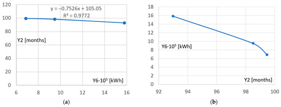 Figure 10a,b indicate non-linear relationships between the amount of energy Y6 produced by the respective PVI and the payback period Y2. It can be seen that with the increase in electricity production, Y6, the payback period decreases.