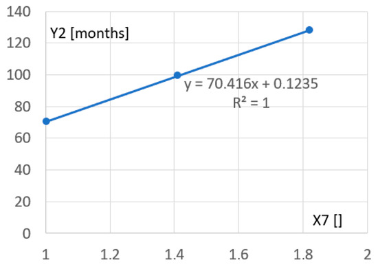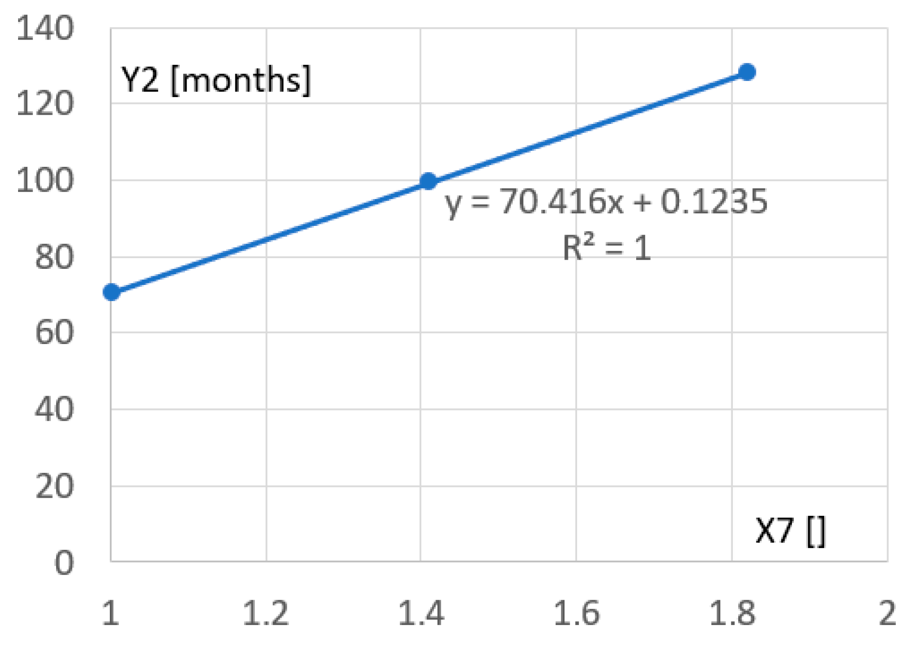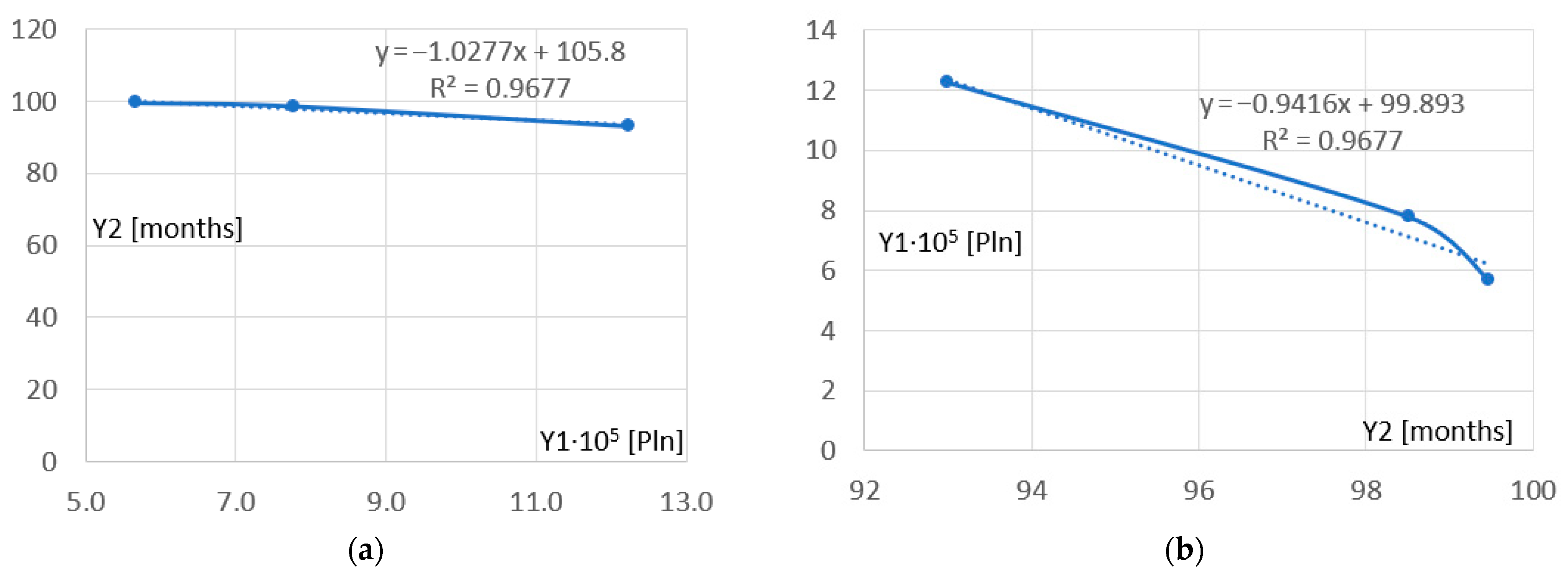 Figure 9a,b indicates a non-linear relationship between the costs Y1 and the payback period Y2 of the modernization investment by the respective optimizing and boundary conditions. It can be seen that as the modernization costs Y1 increase, the payback period decreases, although the change is not very large and concerns a maximum of 6 months for r from 1 to 9, where the value of X8 did not change.