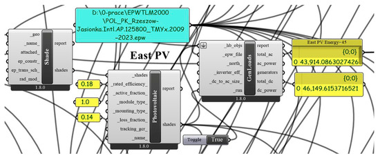 Figure 12. This fragment concerns shaping the geometry of the PV panels (Shade module), PVI configuration (Photovoltaic module) and electricity production (GenLoads module). The files containing meteorological data were automatically downloaded from the dedicated websites, and then opened using an internal module. The Evolutionary Solver of Galapagos was employed to perform the optimizing calculations. The configuration parameters of the Galapagos program were determined and their values are presented in