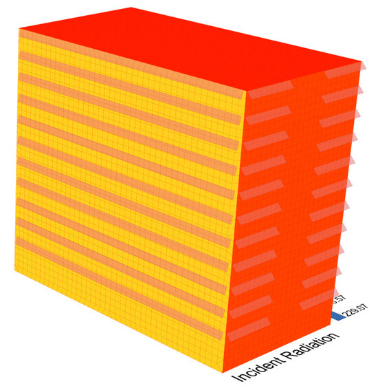 Figure 4a presents a geometric parametric model of a multi-story student residence hall modernized with a PVI distributed as horizontal strips on the western façade and as two large vertical rectangles on the southern façade.