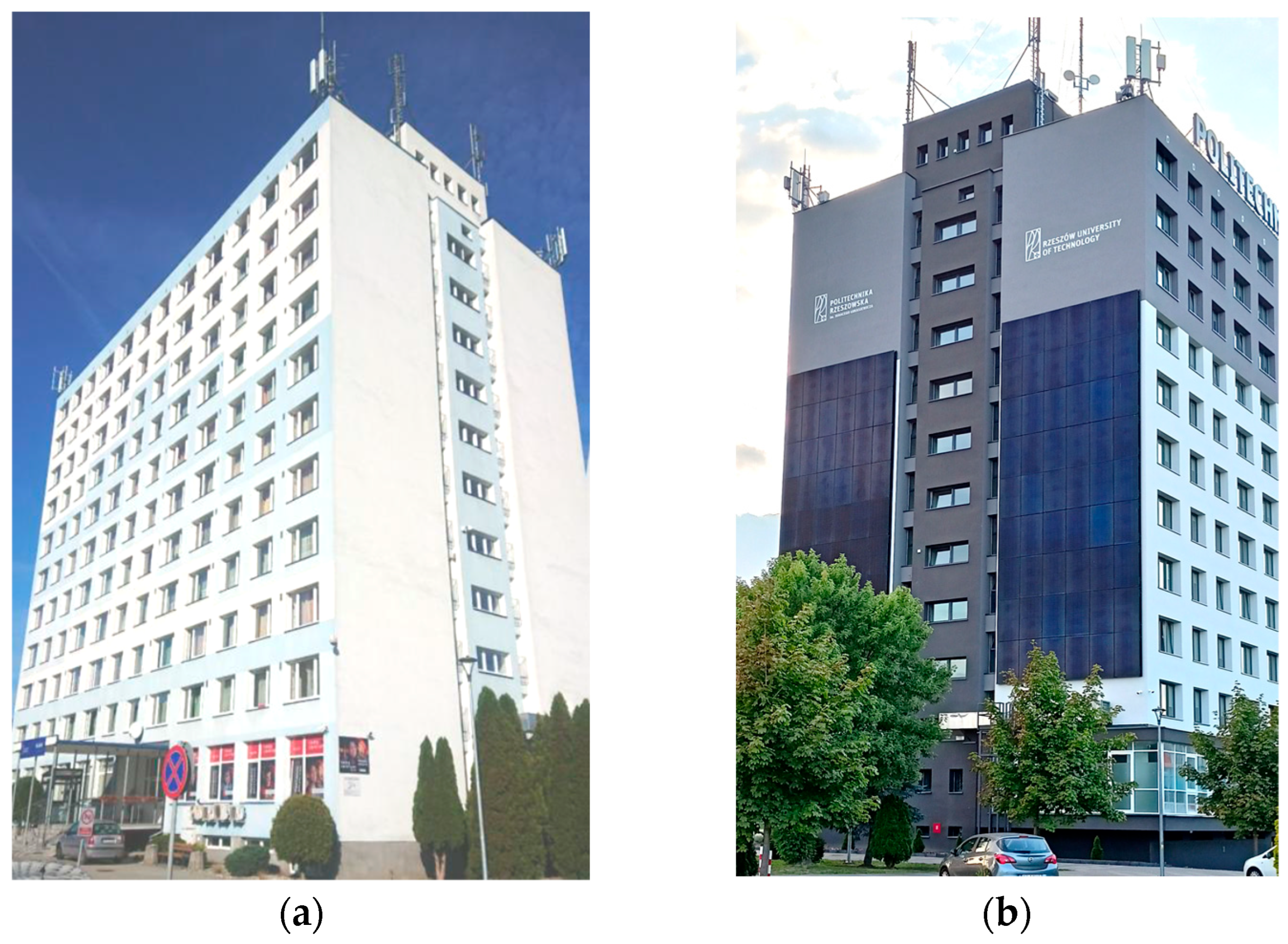 Tall buildings pose a particular challenge when it comes to modernizing their envelopes and installing exterior equipment. Working at high altitude significantly increases modernization costs. On the other hand, the student dormitory’s function increases the demand for electricity during continuous 24 h use of the building, which allows for the size and payback time of modernization investments to be optimized.