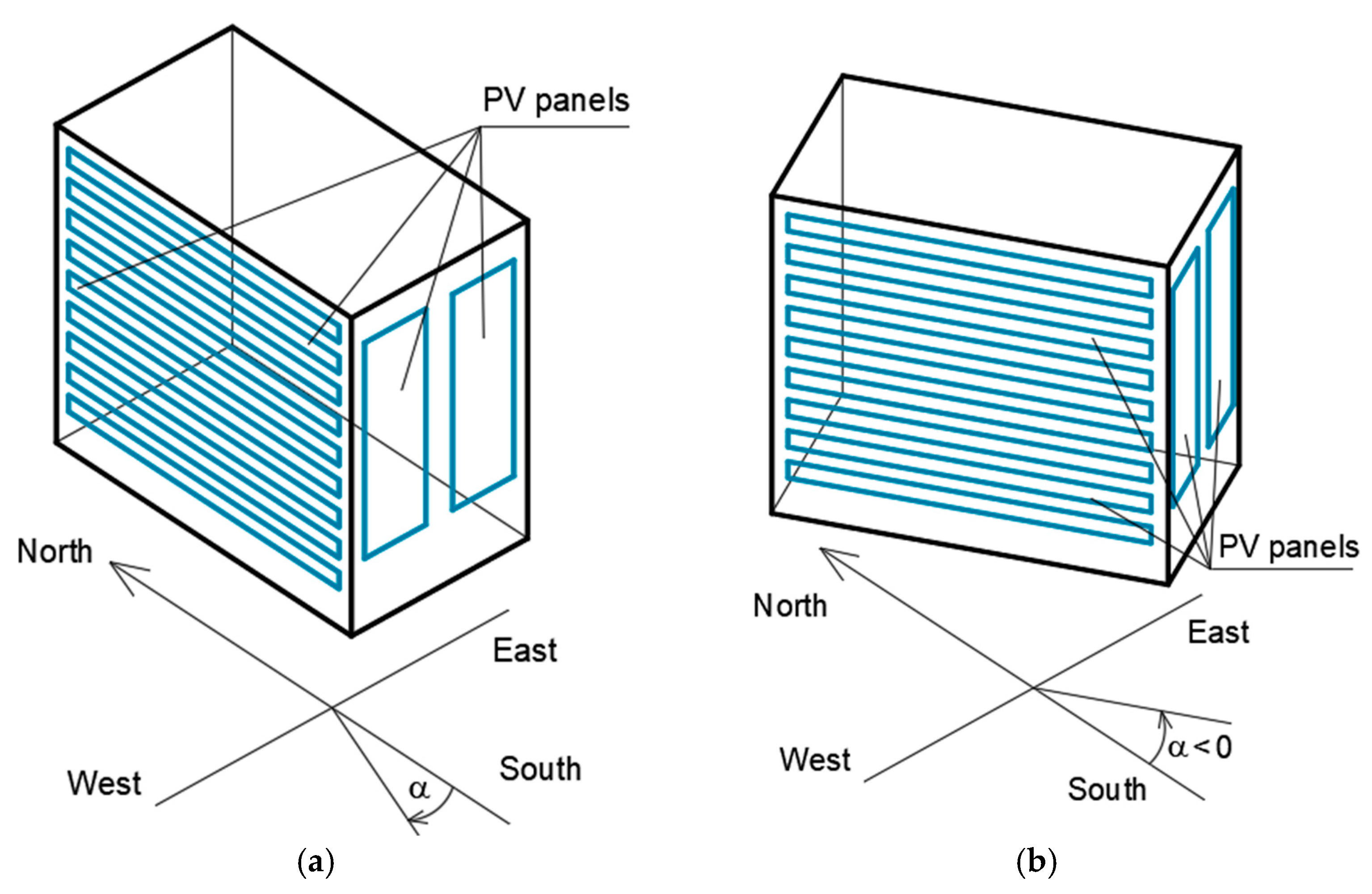 26] increased the scope of the analysis by presenting a new method of determining the optimal azimuth for solar-ready buildings. The method was based on computer simulations minimizing the economic costs of PVI in Finland. The authors proved that the annual energy balance performed with the help of their method can increase the surplus energy generated via renewable energy systems by 46% compared with conventional energy production.