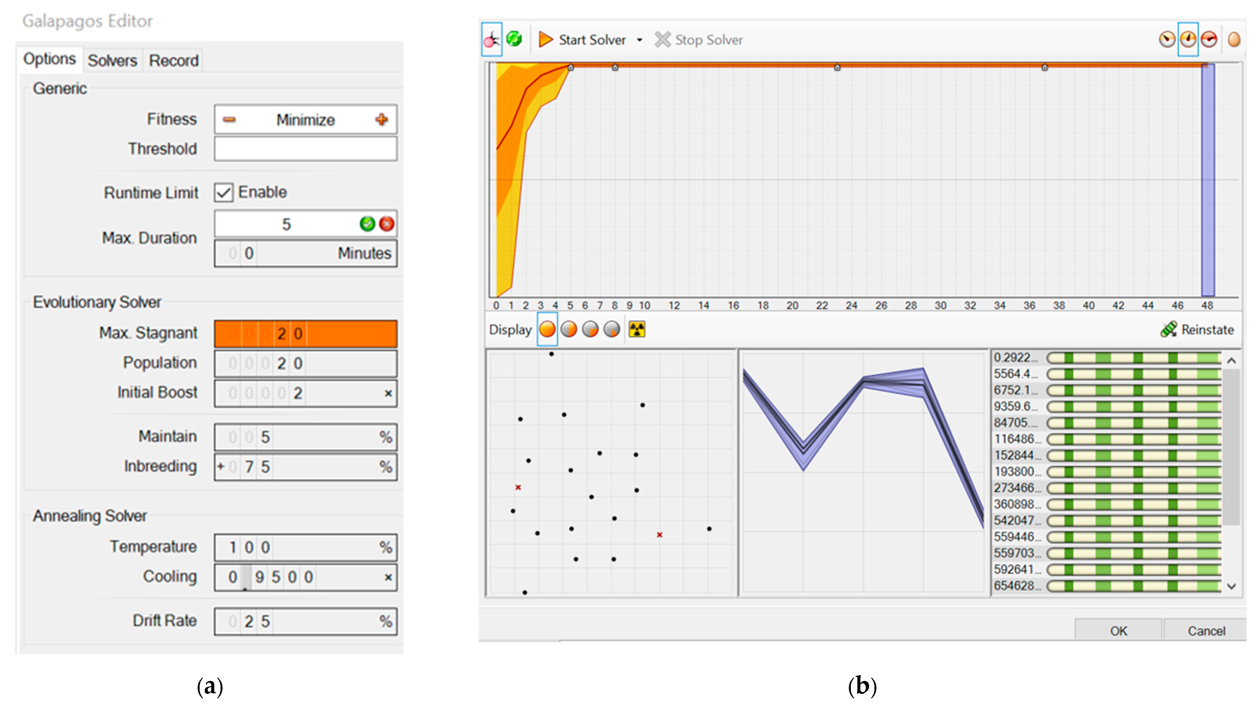 31]. The interface (internal input menu) of the Galapagos application based on genetic algorithms is shown in
