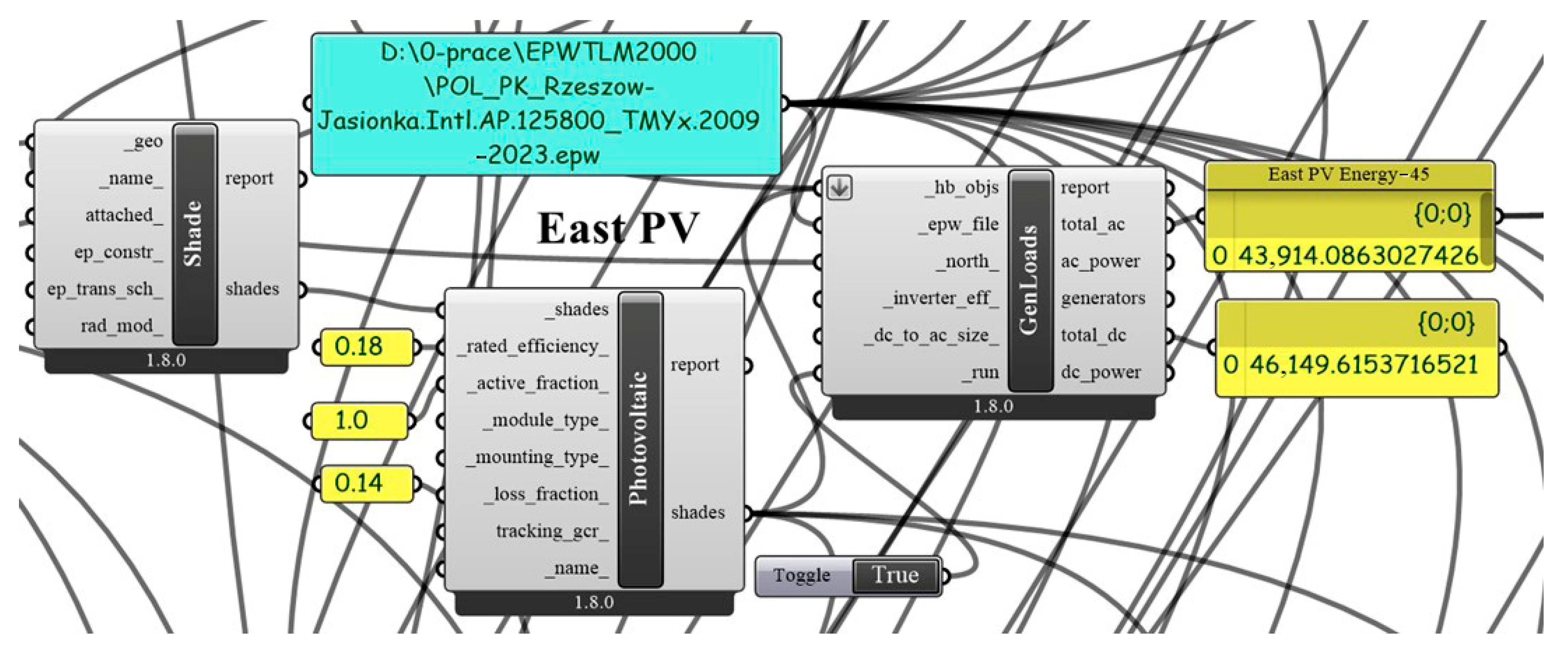 31]. It is desirable to extend this automation to include parameterization of the created models to obtain multiple effective solutions, from which optimal ones could be found. The optimal solutions should be associated with maximizing the electricity produced by photovoltaic installations or minimizing the costs incurred for modernizations. Automation supporting optimal solutions is particularly desirable when a single and most effective solution is sought without the need to analyze the impact of individual parameters on this solution and without searching for a number of similar effective solutions. The authors proved that such automation is possible using parametric procedures available in Rhino/Grasshopper.