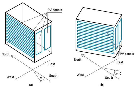 Figure 4a presents a geometric parametric model of a multi-story student residence hall modernized with a PVI distributed as horizontal strips on the western façade and as two large vertical rectangles on the southern façade. Figure 4b shows an identical model of the building with a vertical PV installation, but its azimuth is negative, which results from the rotation of the model, as shown in Figure 4a, by an angle α, the measure of which is negative.