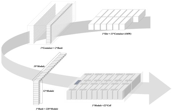 This study analyzes operational data from a 50 MW-class FR ESS located in Geumak, Jeju Island, South Korea, collected from 2023 to 2025. The overall system architecture is shown in Figure 1. The site comprises thirteen 4 MW-class containers; each container generally includes two banks, with the last container comprising a single bank (total: 25 banks). Each bank consists of 19 racks, each rack contains 12 modules, and each module integrates 22 series-connected cells of 112 Ah nominal capacity.