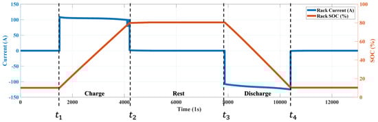 The 10 s pulse duration is chosen to capture not only ohmic resistance but also a portion of polarization resistance, thereby mitigating errors from instantaneous voltage fluctuations. During field operation of the target ESS, 1 s pulses introduced notable uncertainty in DCIR estimation, primarily due to communication bandwidth constraints and limited storage resolution that impeded reliable recording of fast transients. The 10 s duration therefore offers a practical balance between accuracy and robustness under field conditions [23].