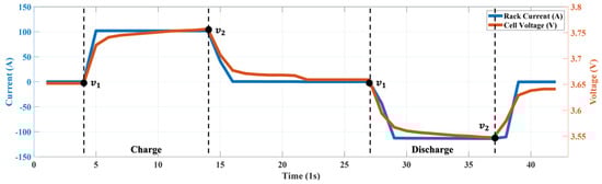 Figure 3 illustrates the charge–discharge procedure employed to determine DCIR. The test is performed at SOC-70%, during which a rated current is applied for approximately 10 s in both charge and discharge, while per-cell voltages are sampled at 1 s resolution. Accounting for the number of instrumented cells across the site (the last container comprises a single bank), this yields approximately 125,400 valid per-cell DCIR measurements per year. This procedure corresponds to the HPPC test, which is widely adopted for DCIR evaluation.
