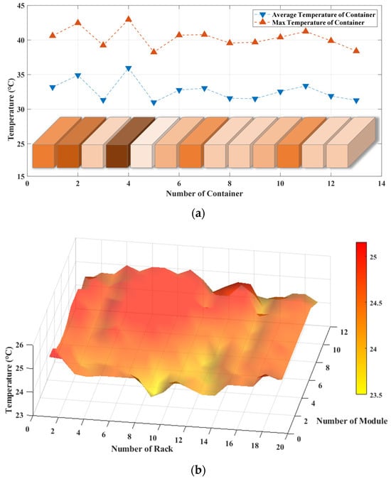 Figure 4. Spatial imbalance in temperature distribution during operation. (a) Temperature distribution across containers during normal operation; (b) temperature distribution observed during the round-trip test of Bank 1 in Container 1.