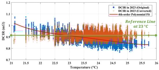 Figure 5 summarizes the workflow using DCIR obtained during HPPC measurements at the Geumak ESS in 2023, where Equation (6) is used to compute per-cell DCIR and the regression model provides the temperature compensation table. The blue scatter shows discharge resistance values measured at various temperatures (SOC = 70%). A fourth-order polynomial regression is fitted to capture the negative temperature–DCIR correlation: the red curve is the fitted regression and the green vertical line marks the 23 °C reference used for compensation. For each temperature, a compensation factor is defined as the ratio of the predicted DCIR at 23 °C to the prediction at the measured temperature. Applying these temperature-specific factors to all blue points yields the red (compensated) scatter. In short, the regression (e.g., Equation (12)) is fitted to the blue scatter; then, as summarized in Table 2, compensation factors equal to the offset relative to the 23 °C reference are derived and applied. Through this regression-based approach, DCIR values are compensated to a consistent temperature, enabling fair comparisons across heterogeneous thermal conditions [26]. Over the full 2023 dataset, compensation reduced the year-level standard deviation from 0.030 to 0.024, improving the reliability of inter-year comparisons.