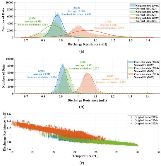 Figure 6. DCIR distributions and their temperature dependence extracted from a 50 MW-class ESS over three years. (a) Histograms of DCIR before temperature compensation, including annual means and standard deviations. (b) Histograms of DCIR after temperature compensation, showing reduced variability along with annual means and standard deviations. (c) Scatter plot of DCIR versus temperature, illustrating the cross-year correlation.