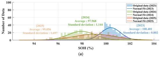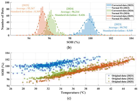 Figure 7. SOH distributions and their temperature dependence extracted from a 50 MW-class ESS over three years. (a) Histograms of SOH before temperature compensation, including annual means and standard deviations. (b) Histograms of SOH after temperature compensation, showing reduced variability along with annual means and standard deviations. (c) Scatter plot of SOH versus temperature, illustrating the cross-year correlation.