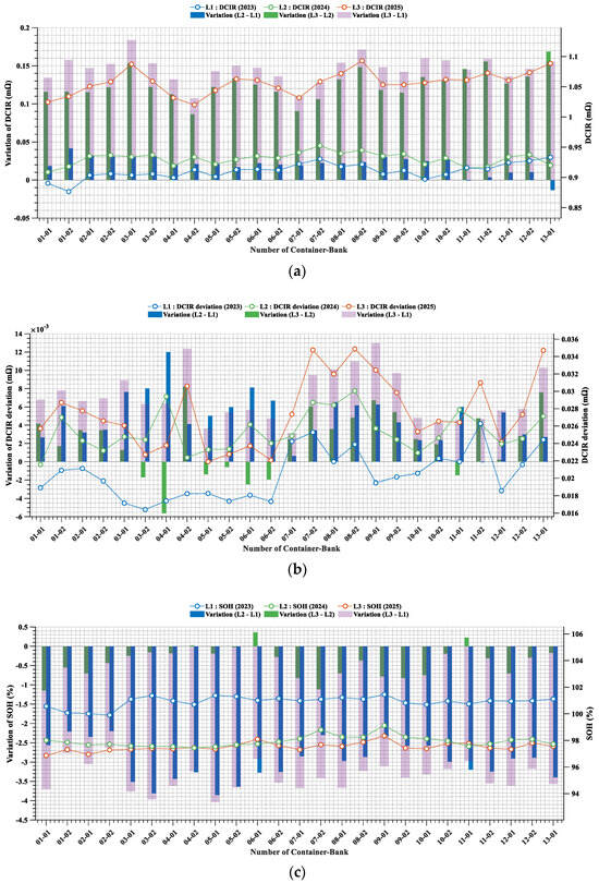 Figure 8. Bank-level analysis of DCIR and SOH over three years of ESS operation. (a) Annual DCIR values and year-to-year standard deviations at the bank level. (b) Standard deviations of DCIR for each bank and their inter-annual changes, reflecting intra-bank variability. (c) Annual SOH values and year-to-year standard deviations at the bank level.