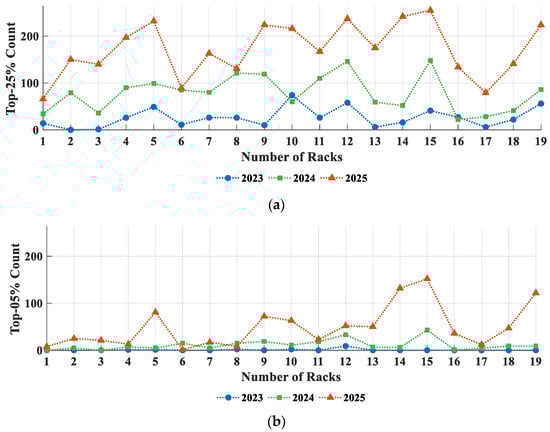 Figure 9. Detailed analysis of intra-bank DCIR distribution for Bank 01 in Container 03. (a) Number of cells within each rack falling in the site-wide top 25% of DCIR. (b) Number of cells within each rack falling in the site-wide top 5% of DCIR.