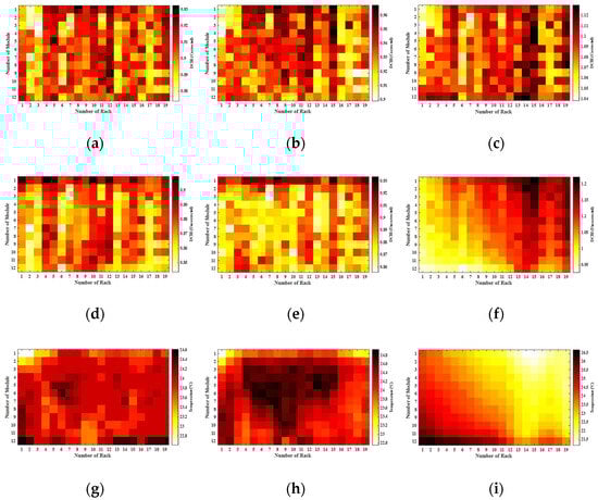 Figure 4a presents simultaneous temperature measurements from 13 operating containers. The schematic colors indicate relative temperature levels; “Max temperature of container” and “Average temperature of container” denote, respectively, the highest and mean module temperatures within each container. Even under the same evaluation procedure, the average temperatures of Containers 4 and 5 differed by more than 5–6 °C, and, within a single container, the gap between the maximum and average module temperatures reached approximately 7 °C. These observations confirm substantial thermal non-uniformity at the container level, with clear implications for degradation indicators such as capacity fade and resistance growth, thereby underscoring the need for temperature compensation in field analyses.
