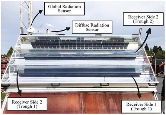 Cabral et al. [24] presented an experimental investigation on a low-concentration PVT solar collector based on a parabolic reflector geometry with a wedge PVT receiver (Figure 2). Electrical and thermal outdoor experiments were carried out, and several parameters were presented, such as the daily instantaneous electrical and thermal performance efficiency diagram. Additionally, an electrical Incidence Angle Modifier (IAM); for both transversal and longitudinal directions was reported. The study estimated an overall heat loss coefficient of 4.1 W/m2 °C and a thermal optical and electrical efficiency of 59% and 8%, respectively. The study shows that the placement of the wedge receiver is susceptible to high incidence angles, as the electrical transversal Incidence Angle Modifier factor decreases significantly after reaching its electrical peak efficiency at 10 °.