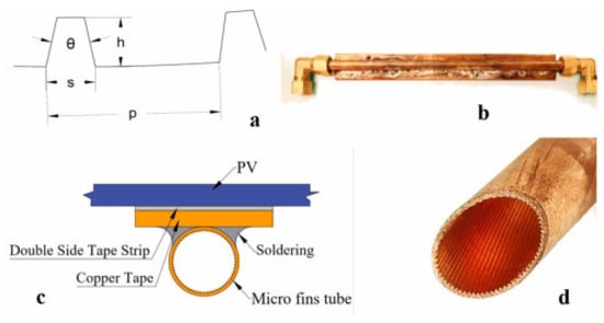 Bassam et al. [31] analysed a PVT system augmented with nano-phase change material (nano-PCM) and micro-fin tubes employing nanofluids using a cooling nanofluid circulation system with micro-fin tubes encased with nano-PCM. The results demonstrated that silicon carbide (SiC) nanoparticles increased the fluids’ thermal conductivity, resulting in higher heat transfer efficiency. When micro-fins, nanofluids, and nano-PCM were combined in the PVT configuration, the maximum thermal efficiency was 77.5%, while the highest electrical efficiency was 9.6%. Figure 3 illustrates the micro-fin tube configuration used in a PVT system, showing how enhanced surface geometry and internal flow structures contribute to improved thermal conductivity and overall system efficiency.