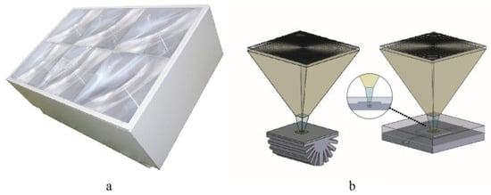 (a) Photograph of the CPV module; (b) Original passive cooling system and designed active cooling system (updated version). The insulation layer atop of the cell has been drawn transparent to distinguish the secondary optical element, the cell, the cell holder and the plate. Reproduced from Moreno et al. [32] under CC BY license.