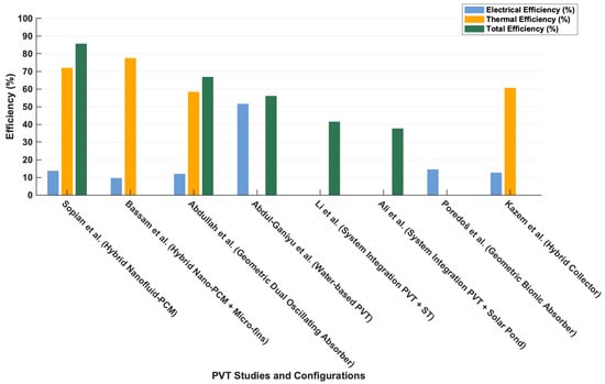 Figure 5 and Table 1 illustrate the electrical, thermal, and overall efficiency percentages reported in various PVT system research papers referenced in this section.