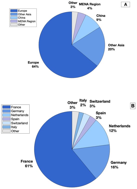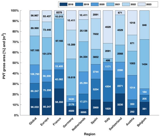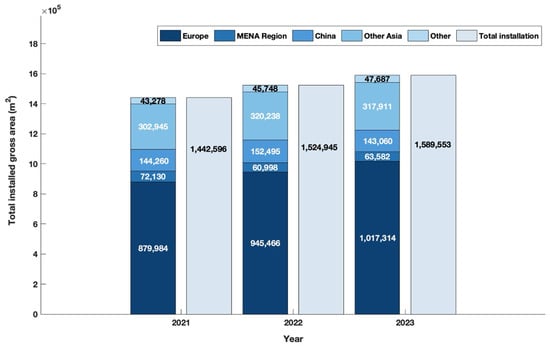 Global distribution of PVT systems in different countries at the end of 2023; the total is almost 1.6 million m2 [16].