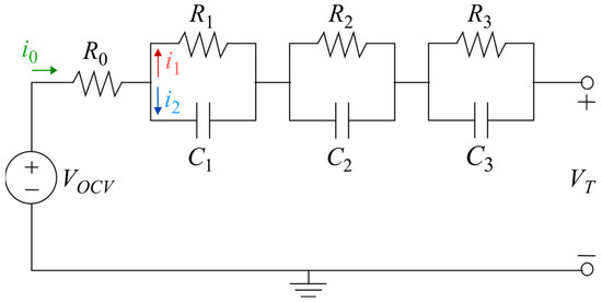 One of the most crucial elements in determining the tracking accuracy of the ECM is the number of parallel RC pairs. Generally, increasing the number of parallel pairs will increase model accuracy, as an infinite number of RC pairs better approximates the Warburg impedance of the cell, albeit at the expense of a greater computational burden [12,13,14]. The aim of the work in this paper, however, is to perform benchmarking on an ECM that produces suitable voltage tracking for both a fresh battery and an aged cell. As suggested in [15], the minimum number of RC time constants required to sufficiently describe the voltage response of an aged cell is three, increasing to as many as five as the cell deteriorates and additional interfaces are formed. Thus, the chosen model is an ECM with three parallel branches, as shown in Figure 1, with a goal of parameterizing the model in relation to key interfaces of the impedance spectrum of the cell.