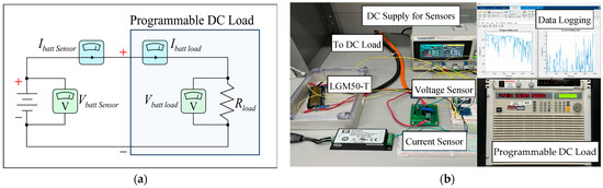 A testbench was designed to control the discharge of the LG M50T NMC-811 cell. The LG M50T cell has a capacity of 5 Ah and a maximum allowable current limit of 1.5C, or 7.5 A, with a voltage between 2.5 and 4.2 V [22]. The scope of this paper focuses only on the discharge parameterization of the cell; thus, a Chroma 63204 programmable DC load was used to automate cell discharge according to the desired current profile. The Chroma 63204 has a current rating of 0–10 A at 2.5–500 V with a resolution accuracy of 0.1%. Serial commands were sent to the load from the host computer, and current and voltage values were queried back at a sampling interval of 0.25 s via RS232 communication. All data logging and serial communication were performed in MATLAB 2024b. To further ensure the accuracy of data collection, a secondary set of measurements was taken; a LEM LTS 6-NP hall sensor was used for current sensing, while a voltage divider with two high-accuracy resistors was used for voltage measurements. The measurements were again sampled at a 0.25 s interval and logged on the host computer. Post data collection, the voltage and current from both sensing sources were compared against one another, having an average deviation of 0.34% and 0.41%, respectively. This discrepancy between the two methods of data collection is negligible and ensures the collected data is representative of cell behavior. The full test bench is illustrated in Figure 2.