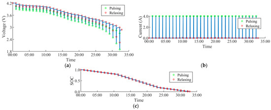 Pulse discharge of LGM-50T cell. (a) Voltage. (b) Current. (c) SOC.