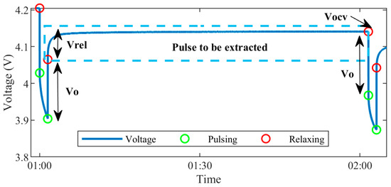 Cell dynamics are most volatile at the upper and lower end of the SOC, where the lithium ions first begin diffusion or are near depletion—thus, the pulse discharge protocol proceeds in smaller SOC steps towards the upper and lower end of the range. Decreasing the step size further would increase model accuracy, at the expense of greatly increasing testing time. Hence, 2% and 5% steps are chosen as a comfortable compromise, giving 32 total SOC breakpoints. The load profile was used to identify points where the current transitioned from low to high, and high to low, being designated as pulsing points. Relaxing points were identified in between these pulsing regions, and each region of relaxation with voltage magnitude, Vrel, was parsed as in Figure 4.
