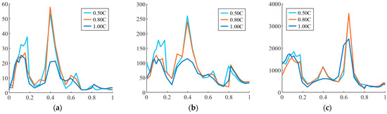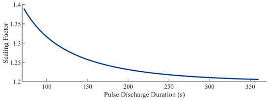 Several conclusions can be drawn from Figure 15: For the parameterization of a pulse discharge test performed at a low C-rate, and thus with a long pulse duration, the degree of undershooting using Method 2 will be small, as the scaling factor is at a minimum. Thus, as observed in Figure 13b, the error spectrum for Method 2 initially starts right-shifted relative to Method 1, underpredicting the correct voltage values. This allows Method 1 to perform better in the transient scenario, despite the obviously worse tracking of the PD profile it produces. As the C-rate of parameterization increases, meaning smaller PD durations, the degree to which Method 2 undershoots voltage predictions exponentially increases. In reference to Figure 15, smaller PD durations equate to an increase in the scaling term applied to the parallel resistances. Both error spectrums tend to shift left with higher C-rates, increasing overshoot. However, Method 2’s exponential capacitive compensation offsets this effect, pushing the spectrum rightward.