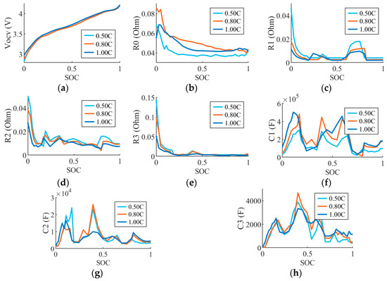 Decreasing transient resistance and capacitance with increased C-rate, Method 1: (a) VOCV; (b) R0; (c) R1; (d) R2; (e) R3; (f) C1; (g) C2; (h) C3.