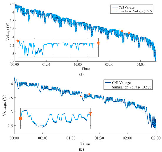 Voltage response of the cell and model tracking. (a) Cell and model voltage response to WLTC. (b) Cell and model voltage response to HC.