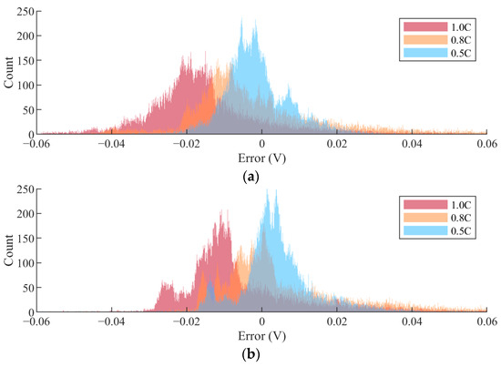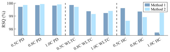 To further aid in visualizing the difference in performance between methods, Figure 12 displays the RSQ for all load profiles, while Figure 13 exhibits the residual error spectrum of both methods for the WLTC and HC profiles. Method 1 clearly has better transient performance than Method 2 for parameterization at a lower C-rate; however, as the C-rate of parameterization increases, Method 2 produces a more accurate parameter set relative to Method 1. Examining the error spectrum of both methods for the WLTC in Figure 13, where the error is defined as the simulated cell voltage subtracted from the experimental cell voltage, the two methods have a clear trend—as the C-rate of parameterization increases, the degree to which the model overshoots accordingly rises. Further evidence of this effect can be seen in Figure 14a, where the model overshooting substantially increases from the parameter set extracted at 0.5C to 1C.
