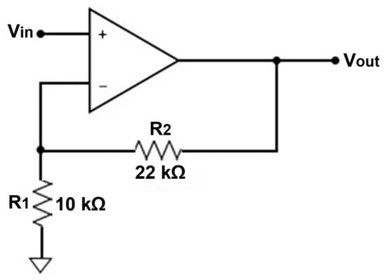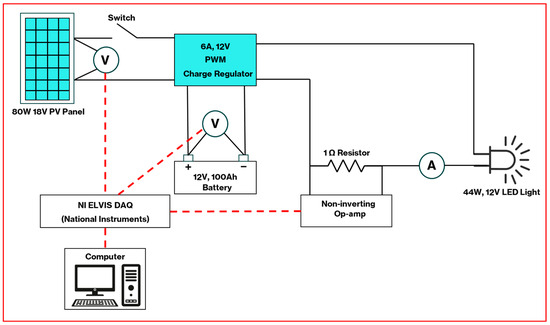 As illustrated in Figure 4, the LabVIEW DAQ system was developed to measure the battery and PV voltage as well as the current consumed by a 44 W LED load via the NI ELVIS prototype board. During voltage measurements, two external voltmeters were used to verify the voltage measurements obtained from the LabVIEW DAQ system. During verification, the battery and PV voltages were adjusted using a calibration scaling factor of 1.196 to align with the actual measured values. The applied calibration scaling factor ensured close agreement between the acquired data and the measured values. To measure the load current, a simple 741 non-inverting op-amp circuit with a gain of 3.2 (Gain = R2/R1 + 1) on an NI ELVIS prototype board was used, as shown in Figure 5.