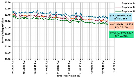 As shown in Figure 6, when the load is connected, the battery voltage fluctuates to represent charging and discharging activity as a result of a change in solar irradiance due to partly cloudy conditions. During the winter season, when solar radiation is limited, the observed decline in battery voltage indicates that the solar PV panel is unable to meet the full load demand on its own. Hence, the batteries discharge to compensate for the energy deficit. This discharging process occurs under all three charge regulators. To compare their discharge performance, the Linear Regression Analysis (LRA) method is applied to analyze the gradients of the battery voltage curves. The linear line (trendline) for each regulator is shown by the dashed lines as determined from data series. In this context, a steeper slope corresponds to a more rapid discharge rate, thereby providing a quantitative basis for performance comparison. The comparison indicates that regulator A exhibits a more favorable gradient of −2.2355, suggesting a slower battery discharge rate compared to the other two charge regulators. Such performance is attributed to lower internal losses, likely due to reduced idle current consumption. This represents that regulator A offers the best charging performance as compared to the other two charge regulators.