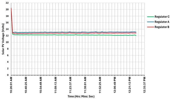 Figure 6, Figure 7 and Figure 8 present the battery voltage, solar PV voltage, and load current data as acquired simultaneously via LabVIEW for each PWM charge regulator. Prior to switching on the LED lighting load, battery voltages were measured at 10:26:01 a.m. to verify that all batteries are in a fully charged state, as shown in Figure 6. Hence, the open-circuit battery voltage in each circuit was approximately 12.48 V since they are in a fully charged state. The corresponding open-circuit voltage across each solar panel was around 20 V, namely 20.21425808 V, 20.033674 V, and 20.166225 V, respectively, as shown in Table A1 and Figure 7, since no load was connected. Following confirmation of the batteries’ fully charged condition, all three charge regulator circuits were simultaneously activated to supply power to their respective loads for a duration of two hours, during which data was recorded.